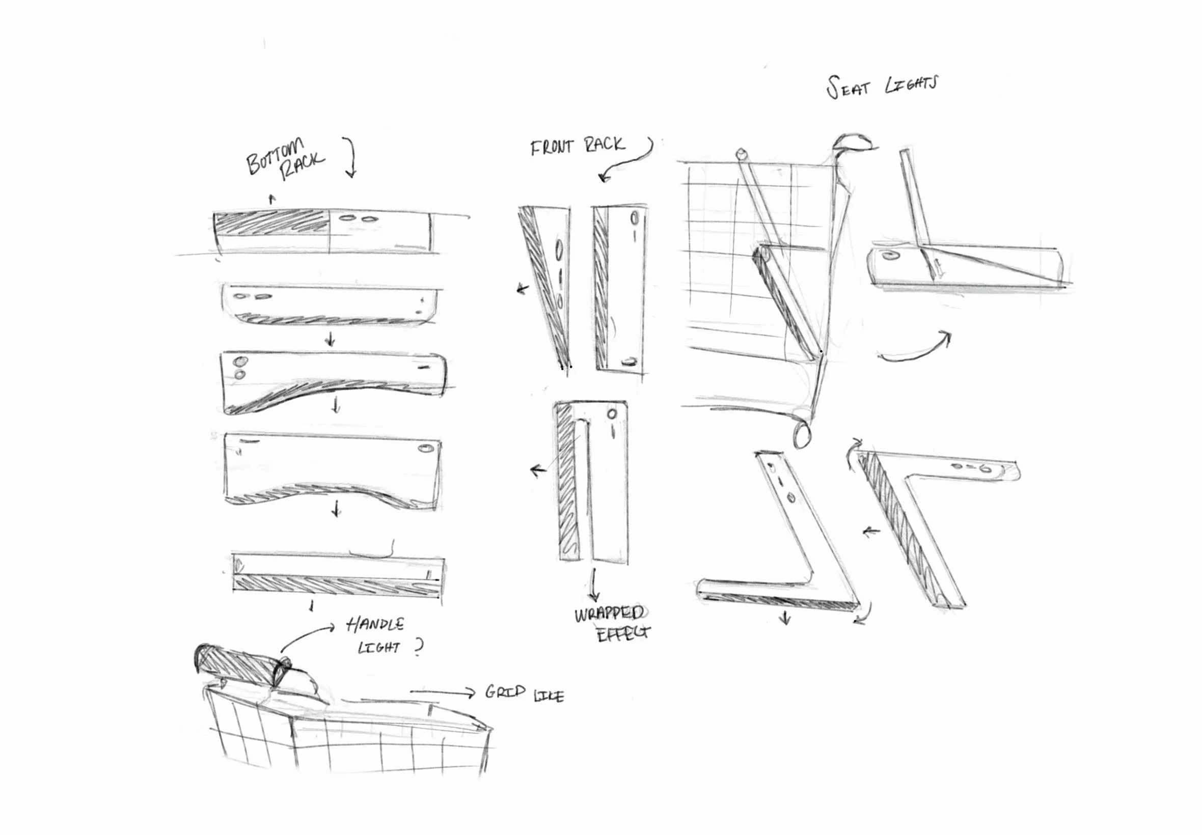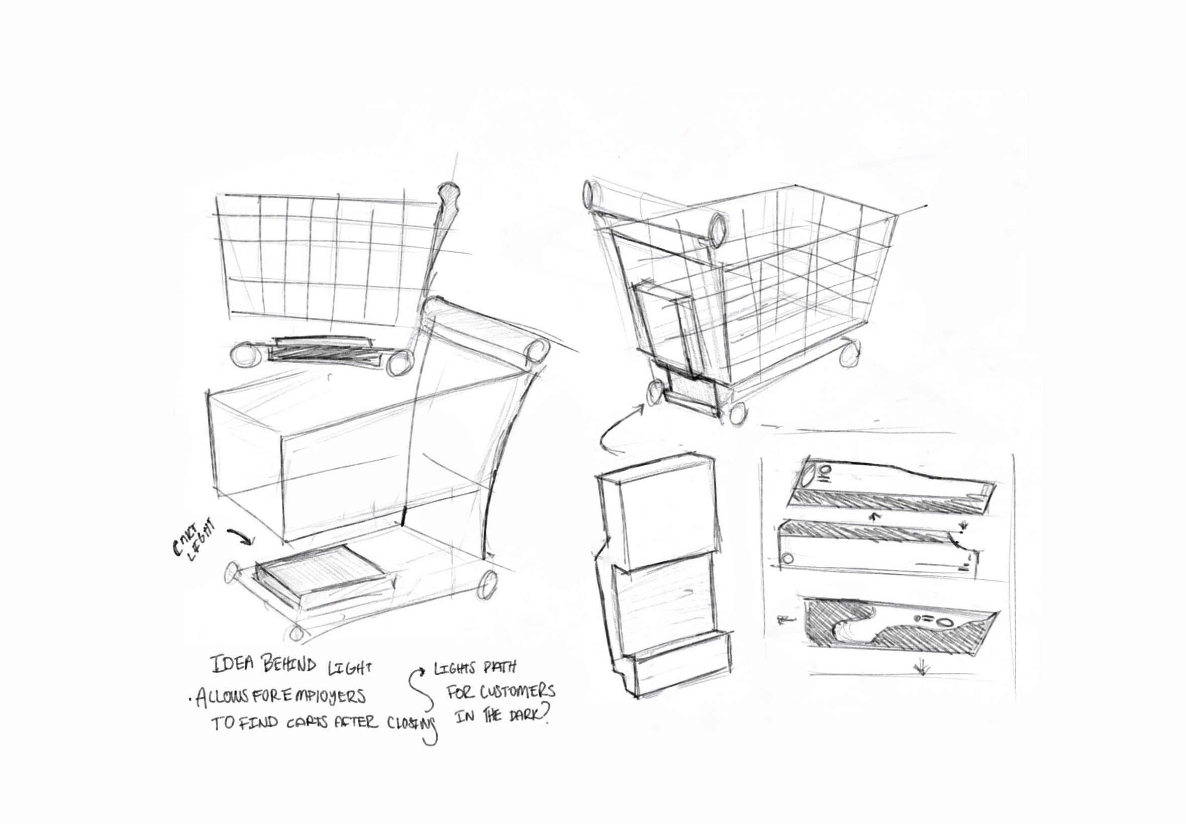 Keeping the simple geometric shapes will allow easy integration into todays standard manjufactored shopping carts. The display case like lighting will allow for a outlined shadow that helps customers see where their cart is. While also helping employers easily identify where a missing car may be outside. This lights may eventually take on different colors or flashing patterns to convey different meanings.