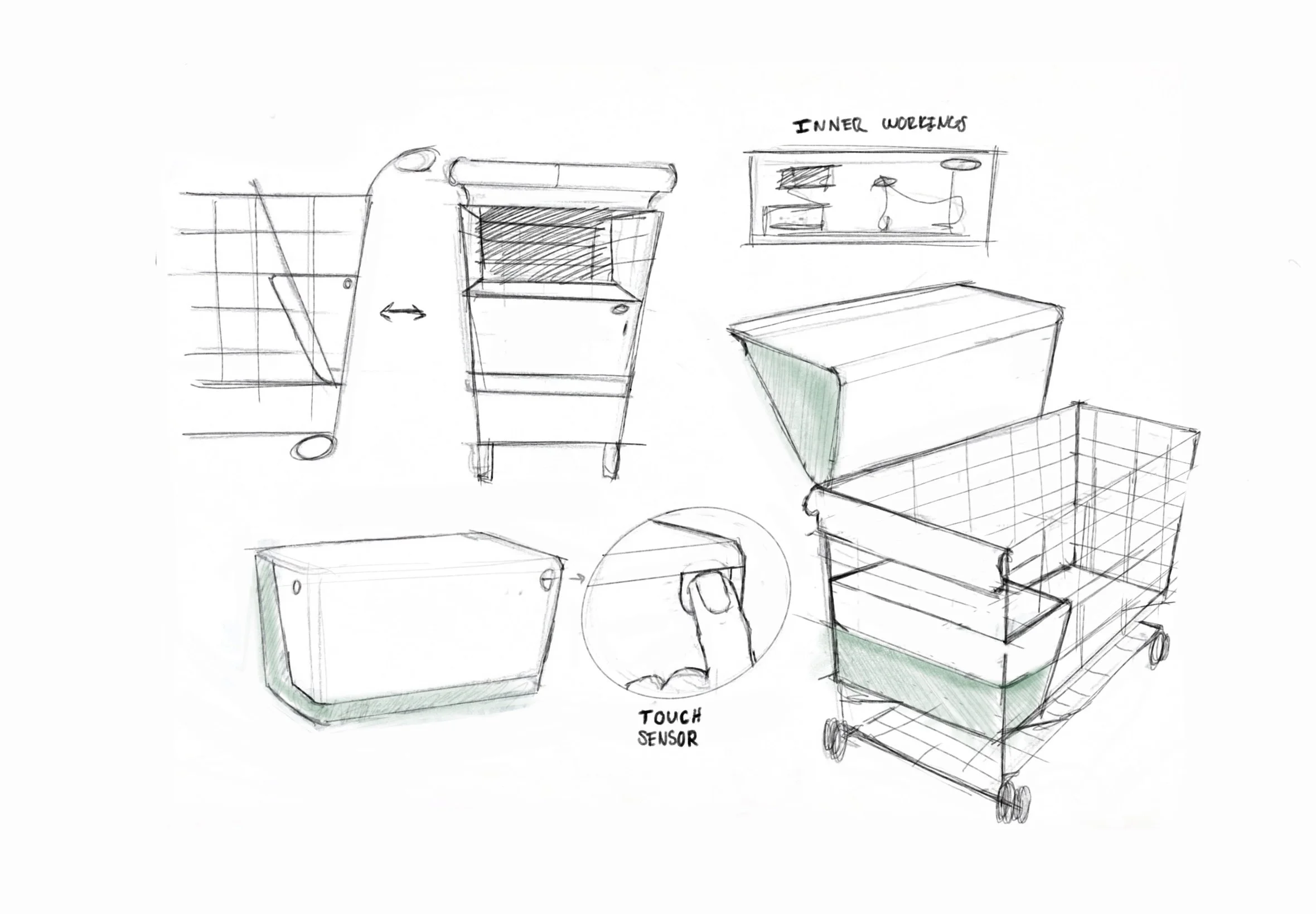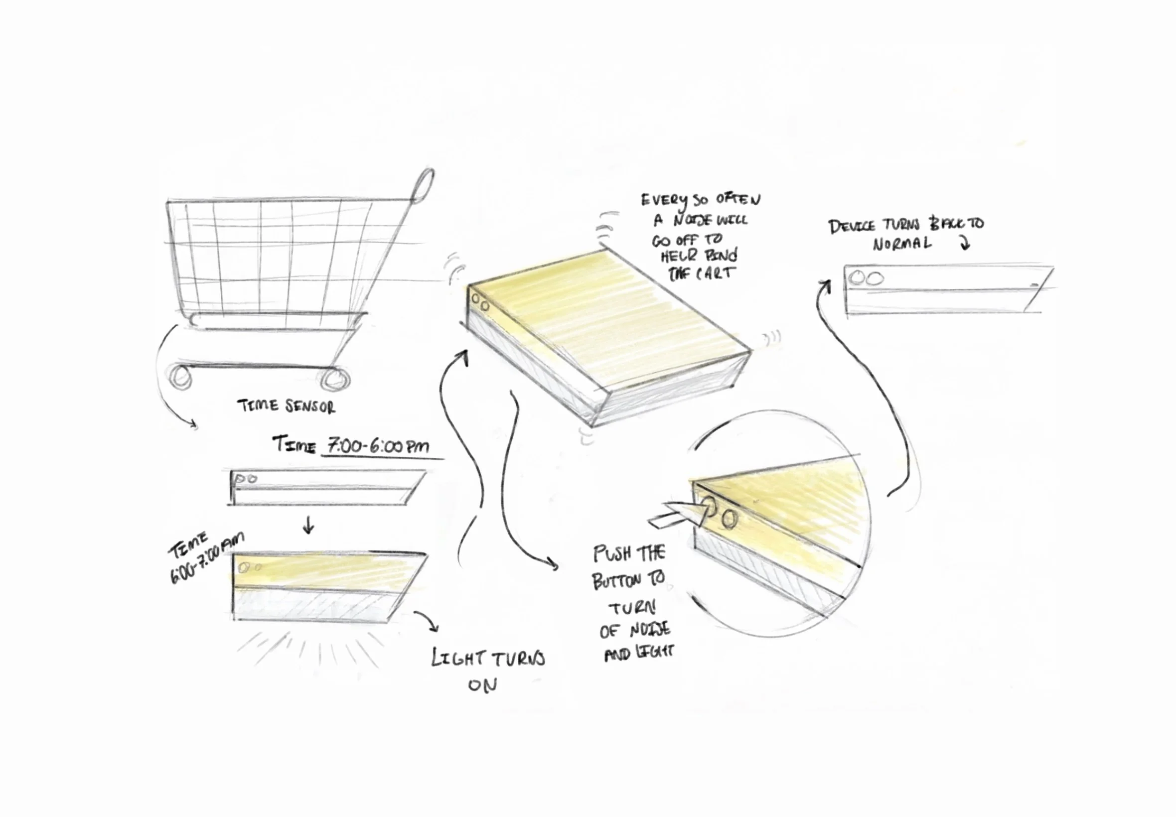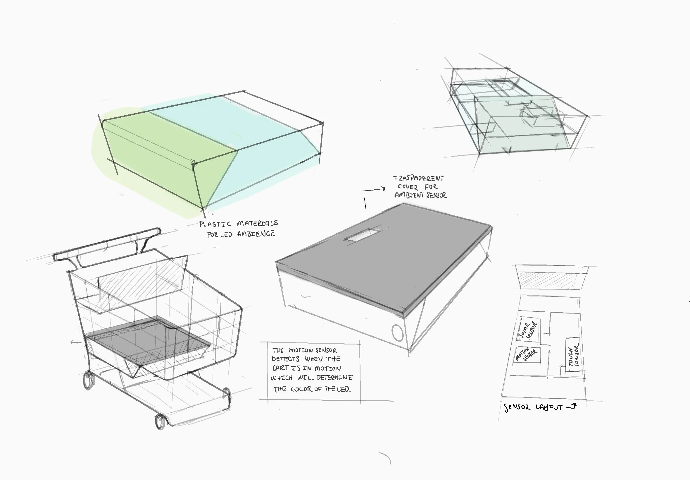 As part of exploring this solution learning how the sensors embedded in the cart interacts with its surroundings, Such as detecting movement, lighting, or proximity to designated cart zones. These environmental cues, have the LED light respond by turning on/off or changing color to signal whether a cart is in use, lost, or where it should be. This visual cue is designed to be easily noticeable by both customers and employees, guiding them to carts more efficiently and prompting action.